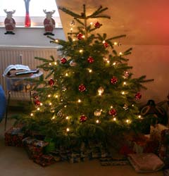Rufus fühlt sich neben dem Weihnachtsbaum anscheinend sehr wohl.